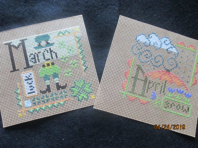I have been getting quite a bit of stitching in the past couple weeks and hope to have a marathon stitching weekend upcoming (more about that later). We had driven to Baltimore to pick up my parents and bring them here for a visit...that's two days, one up and back, of 6 hours in the car. I worked on my A Year of Celebration, March and April. If you recall, March is a do-over as I didn't care for it on the 18 count fabric. So, I decided to do them all on 14 count perforated paper. March only needs the background stitching finished and April is about half done. They are much smaller now and will work better on the box I have in mind for finishing.